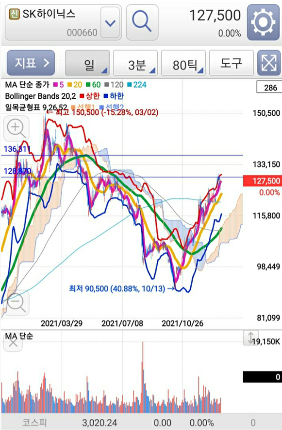 SK하이닉스의 주식 차트를 살펴볼게요. 저항대 가격인 12만8000원에 전체 매물의 21%가 몰려 있어서 매우 저항대가 두껍습니다. (가로선을 주목하세요) 그래서 큰 거래량을 동반한 양봉이 저항을 초과하면 이 가격대가 지지가 되서 SK하이닉스 주가가 상승할 가능성이 높다고 판단됩니다. 그러면 그 다음 저항대는 13만6천원 대가 되겠죠.