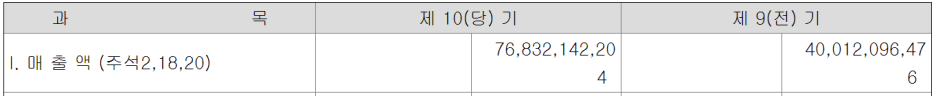 간단하게 매출액과 영업이익만 보면, 2019년 매출액 약 768억원, 영업이익 약 311억원입니다.